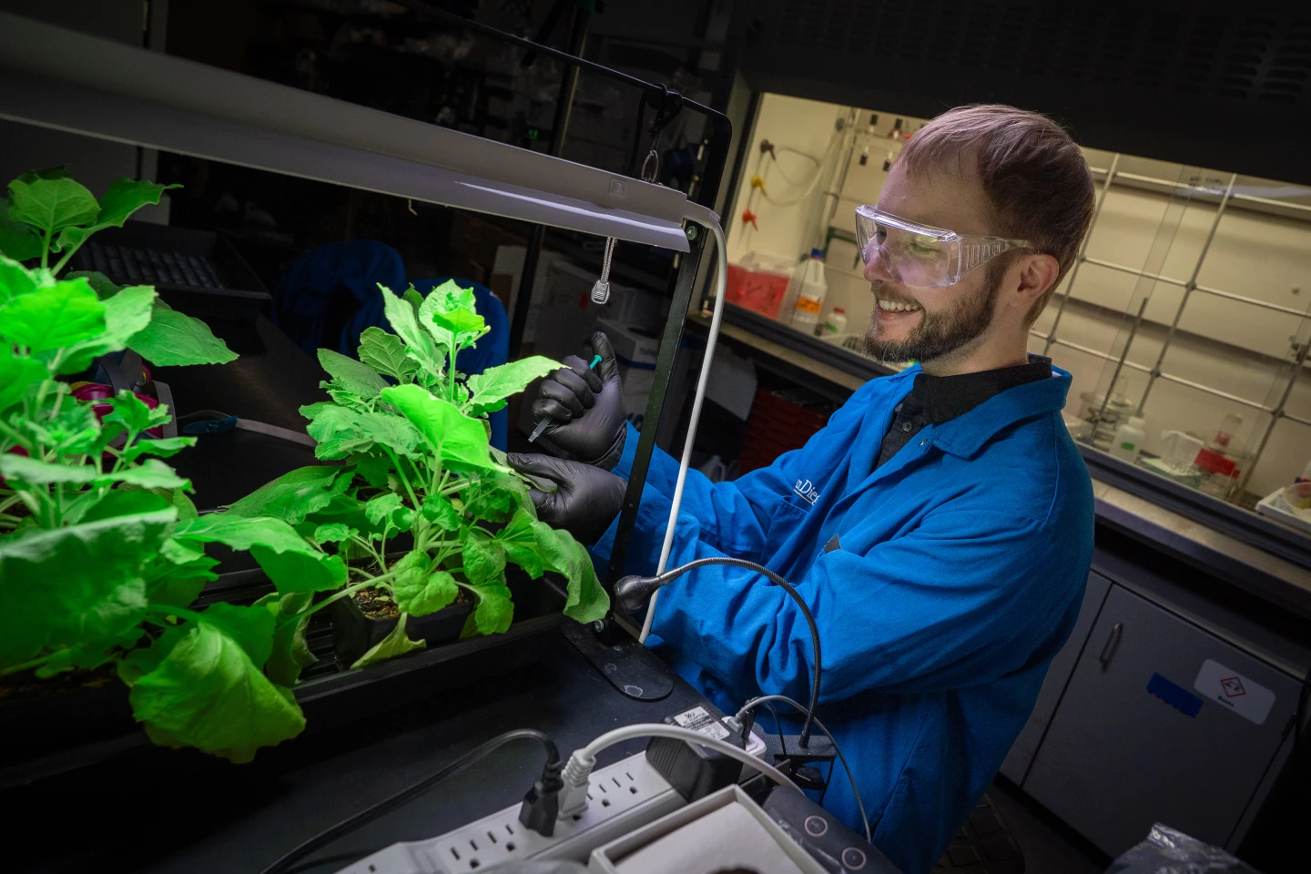 Postdoctoral researcher Patrick Opdensteinen infects a plant leaf with bacteria