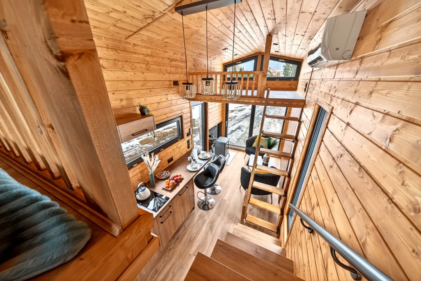 The Katrin tiny house packs a lot of flexibility into its compact frame. Sleeping four adults comfortably, it can be upgraded to run off-grid and features a well-thought-out interior that includes a space-saving folding staircase and underfloor heating.