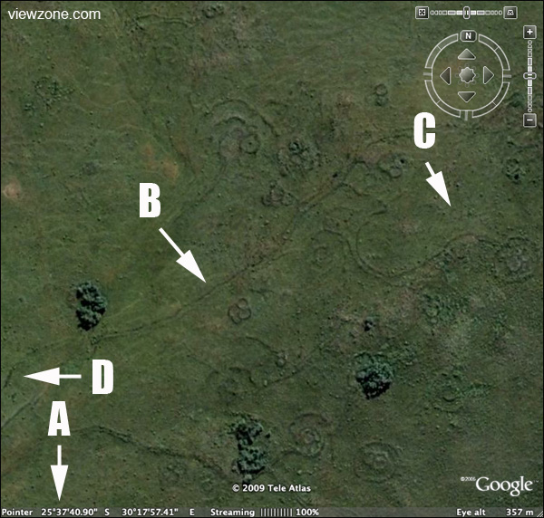 This is what you will see on google-earth at 25 37'40.90"S / 30 17'57.41E [A]. We are viewing the scene from an altitude of 357 meters.