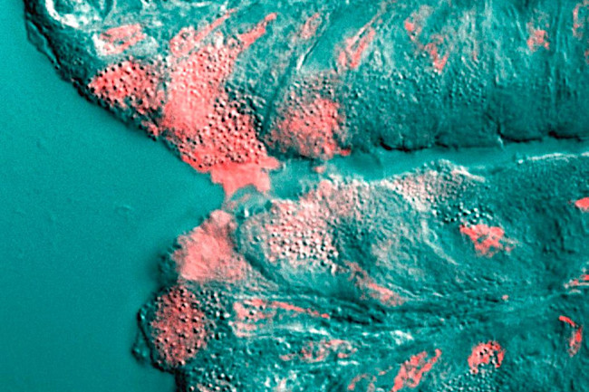 Mucus (shown in pink) is secreted by a cell in the stomach. (Credit: Underwood 2006 PLoS Biology)