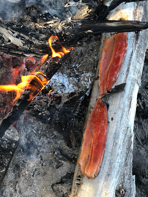 What we see here is a completely effective way to nicely cook fish. Simply placing the two fillets on a log and setting it by burning wood is enough to cook it. This can also apply to other small game as well.