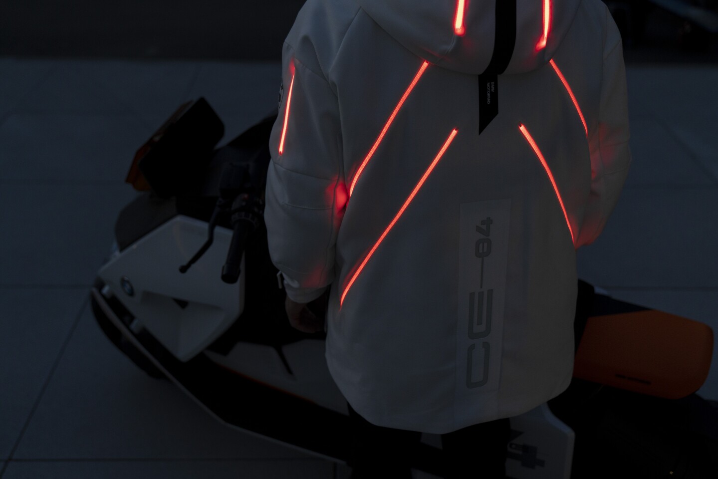 The jacket has its own power source, enabling it to communicate with the bike and double the brake lights, as well as to charge your phone inductively while it's in your pocket