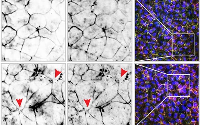 In the bottom frames, burst cell junctions in the gut lining can be seen after being exposed to e-cigarette chemicals as compared to healthy cells in the top frames