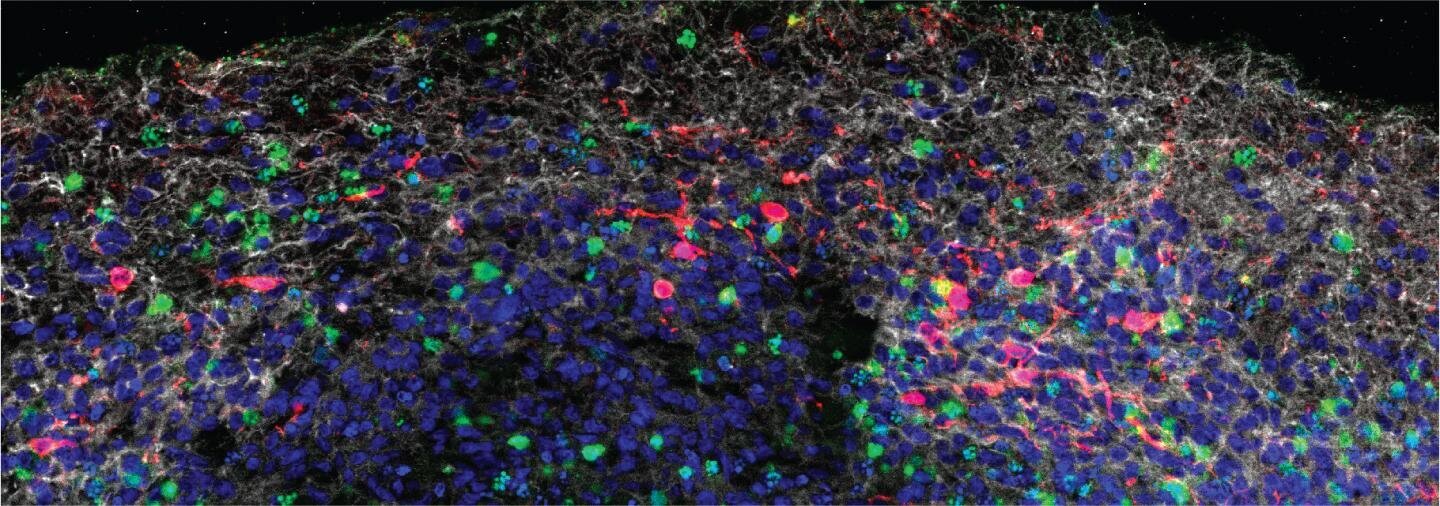 An image of a human brain organoid shows numerous dying cells (green) surrounding neurons (gray) that have been infected by SARS-CoV-2 (red)