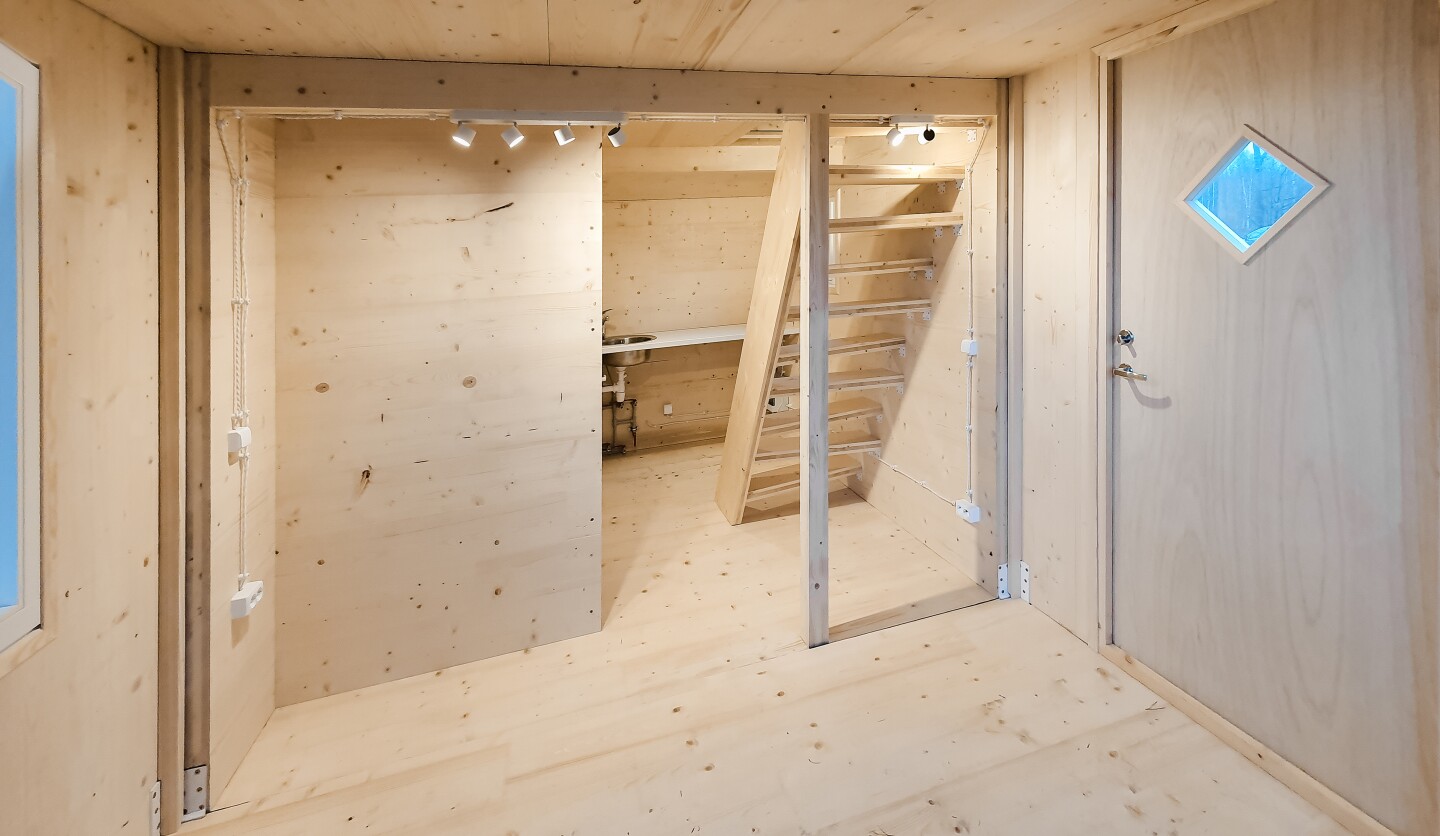 The Rustic model shown features a basic and quite snug layout. Visitors enter into a combined living, kitchen, and dining area, with space for seating and a dining table. The kitchen, such as it is, contains a sink and countertop as standard. Nearby is the bathroom, which has a shower, sink, and toilet. Steps lead up to the sole bedroom, which is a tiny house-style loft sleeping area with a low ceiling and a hatch to close off the stairs area.