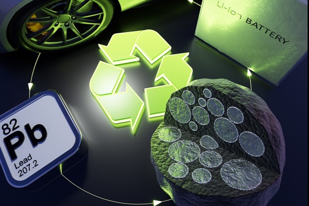 Artist's impression of the new lead-based shell particles as an anode material, alongside a lithium battery and electric vehicle