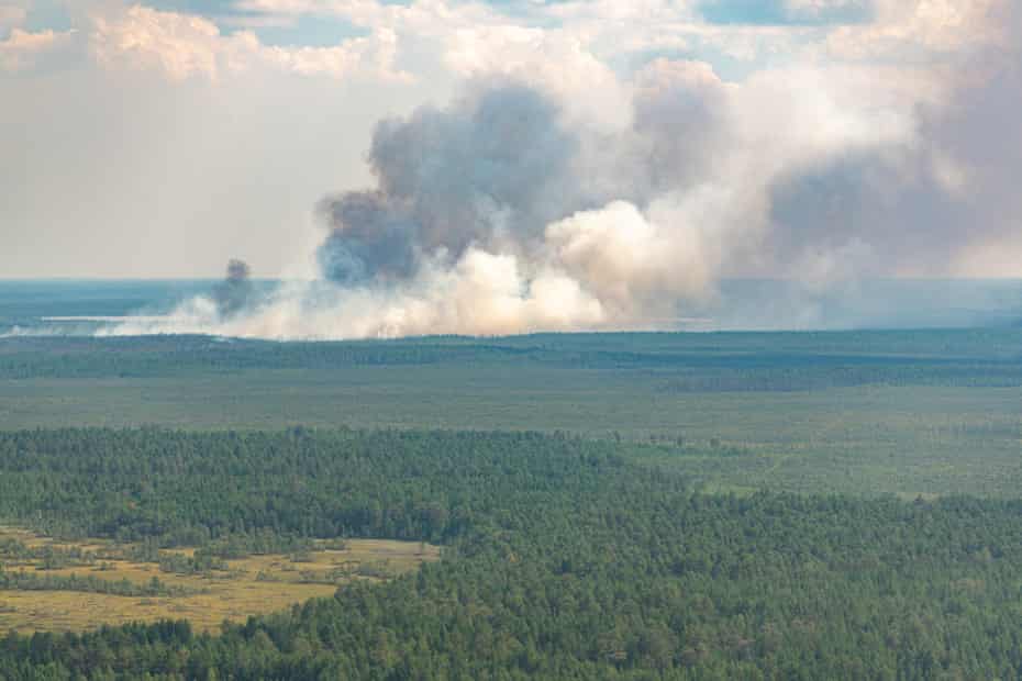 An aerial view of a wildfire in the taiga in the Khanty-Mansi Autonomous Area, in north-west Siberia. The boreal forests of Siberia are under attack from higher temperatures. Photograph: Denis Bushkovsky/Tass