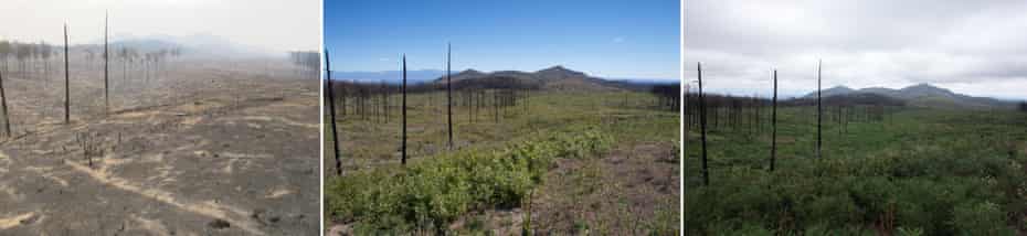 A series of photographs taken in 2011, 2013 and 2014 by researcher Craig Allen in the footprint of the Las Conchas fire, a 2011 ‘megafire’ in the eastern Jemez mountains. The images show little tree regrowth. Composite: Craig Allen