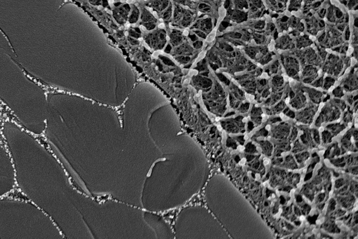 A microscope image of the material, showing the interface between the hydrogel (left) and the polymer (right)