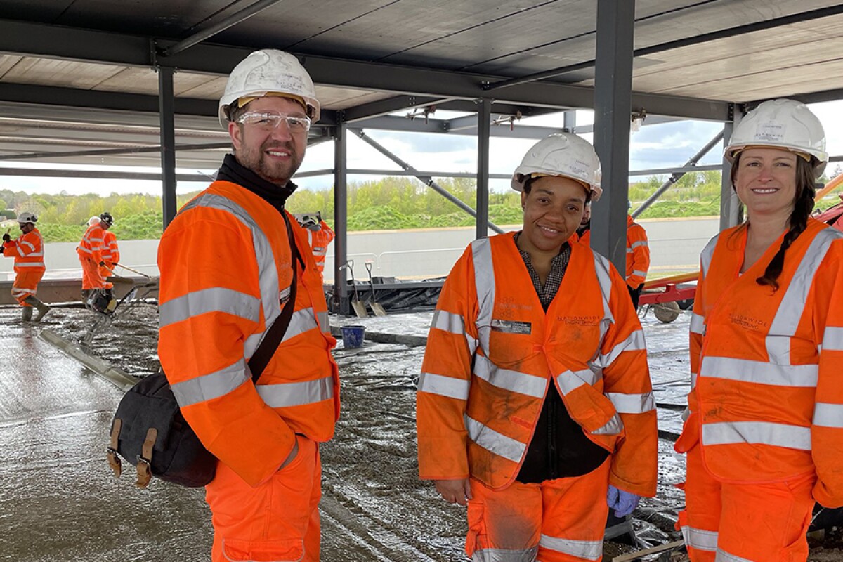University of Manchester researchers Craig Dawson, Happiness Ijije and Lisa Scullion onsite as workers tend to the world's first graphene-enhanced concrete slab in the background