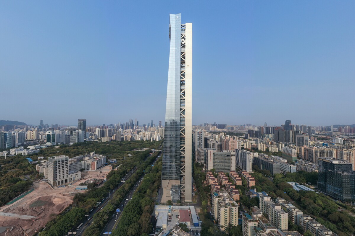 Hanking Center in Shenzhen, China, is the tallest detached-core skyscraper in the world and reaches a maximum height of 359.8 m (1,180 ft)