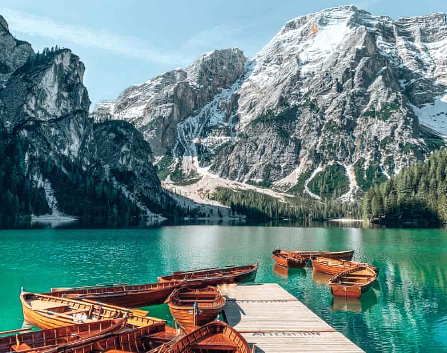 Lago di Braies in the Dolomites, surrounded by limestone peaks. Photograph: Marc Eger/Getty Images