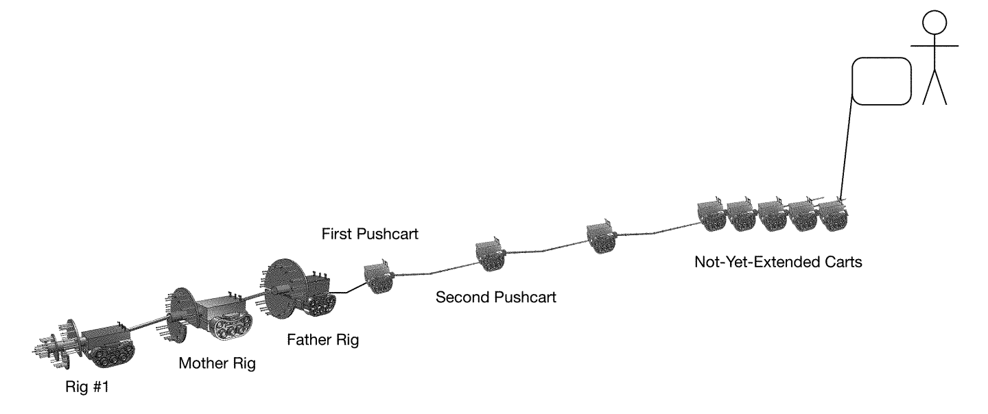 Where Petra's thermal drilling robot moves its head around to widen its hole, the RBR will fire on all torches at once, and rotate the torch-bearing discs to ensure full coverage, blasting the rock backward and collecting it into small pushcarts, each connected along the cable supplying electricity to the drill rig.
