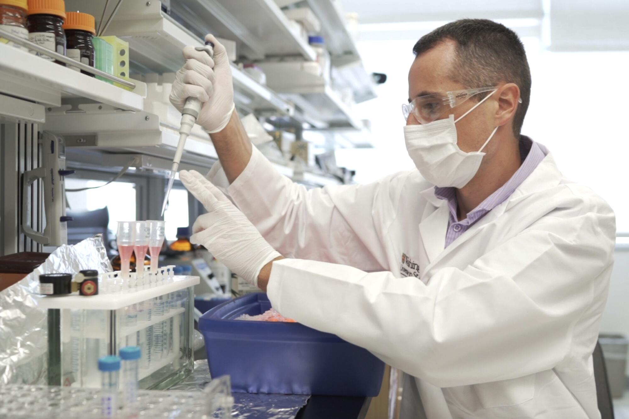 A researcher at Washington University in St. Louis works on a blood test for Alzheimer’s disease.
