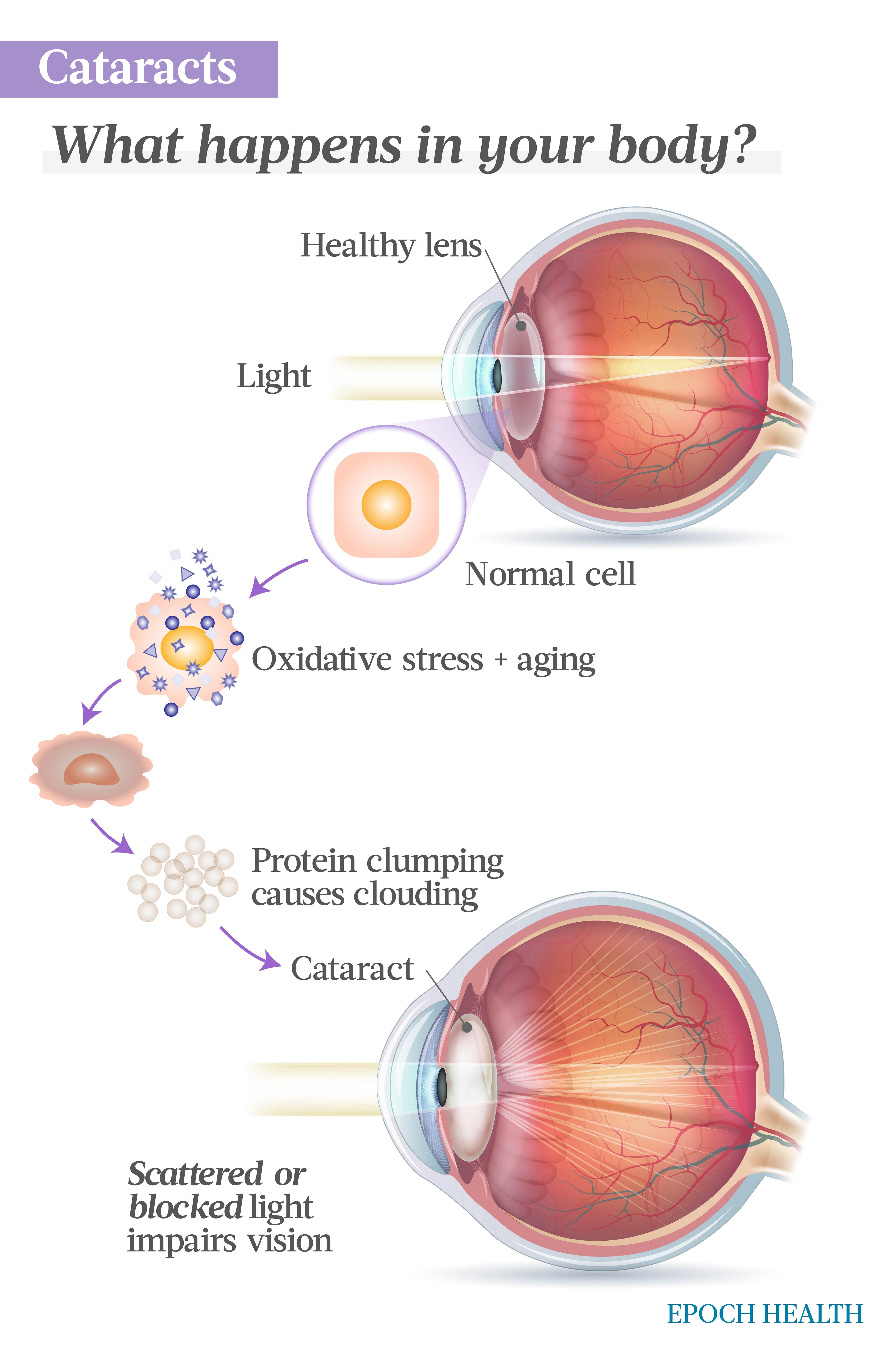 Oxidative stress is a factor in cataract development. Aging, compounded with oxidative stress, can result in disordered proteins that clump together and obscure the passage of light, hindering vision. (Illustration by The Epoch Times, Shutterstock)