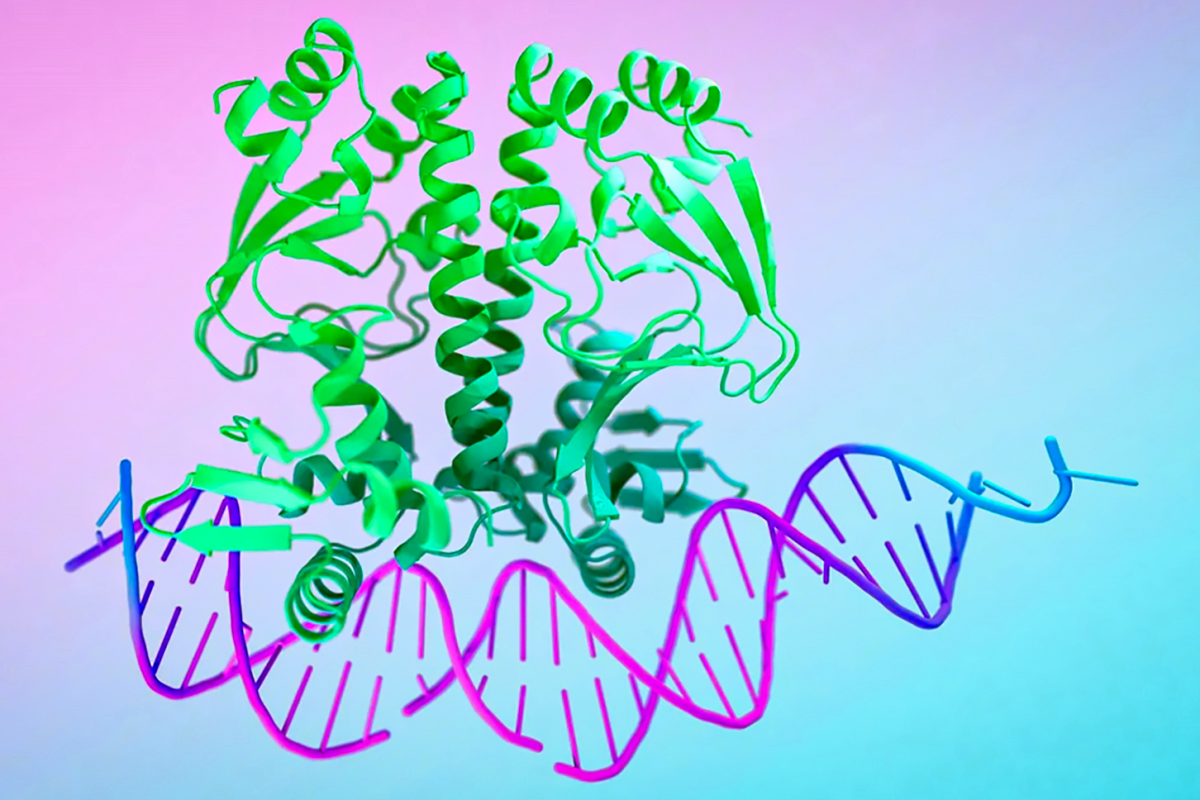 AlphaFold 3’s prediction for a molecular complex featuring a protein (blue) bound to a DNA double helix (pink) is a near-perfect match to the true molecular structure (gray)