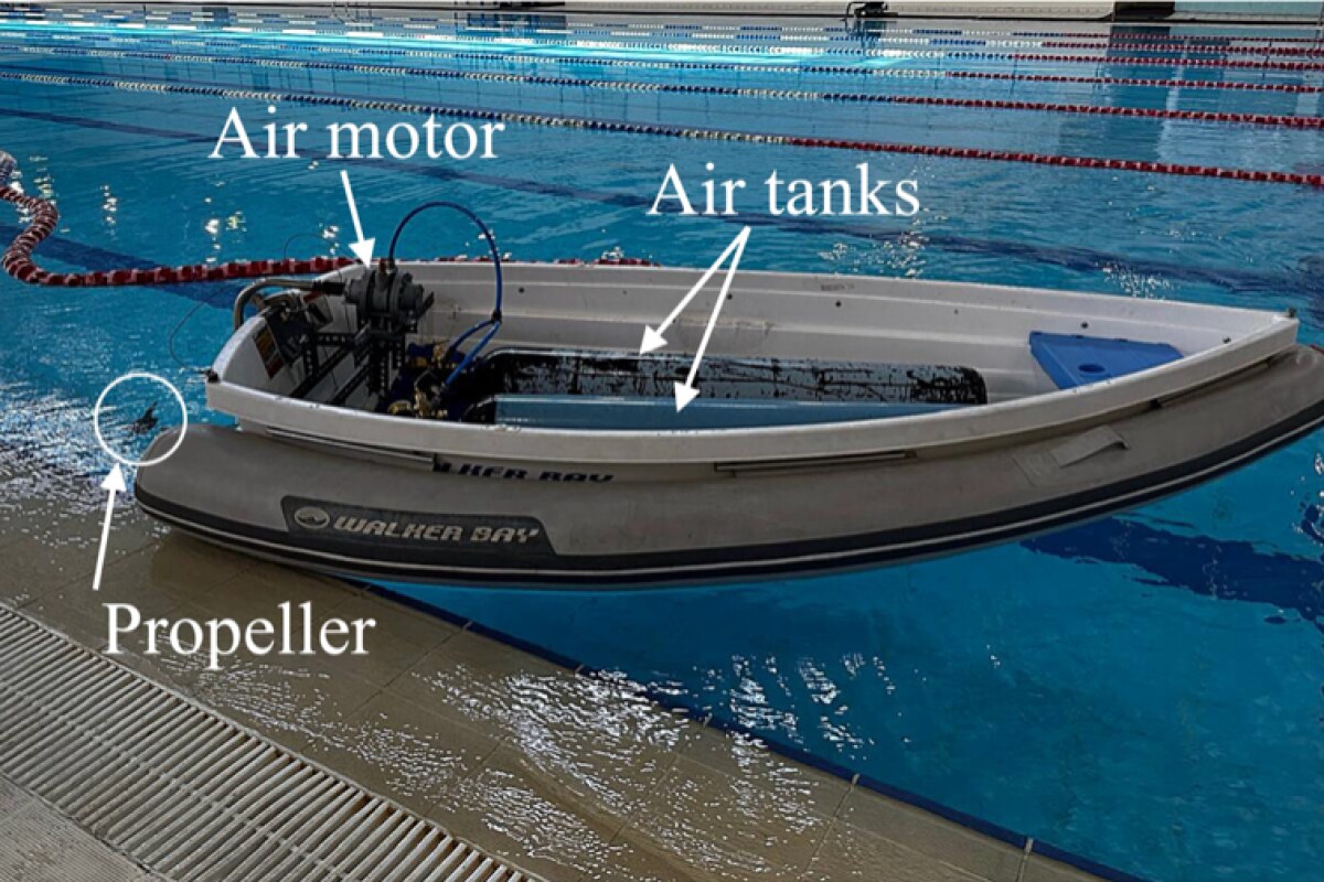 In swimming pool tests, the system was installed on a three-to-four-passenger PVC boat which was made to resemble the Abra ferries commonly used in the United Arab Emirates.