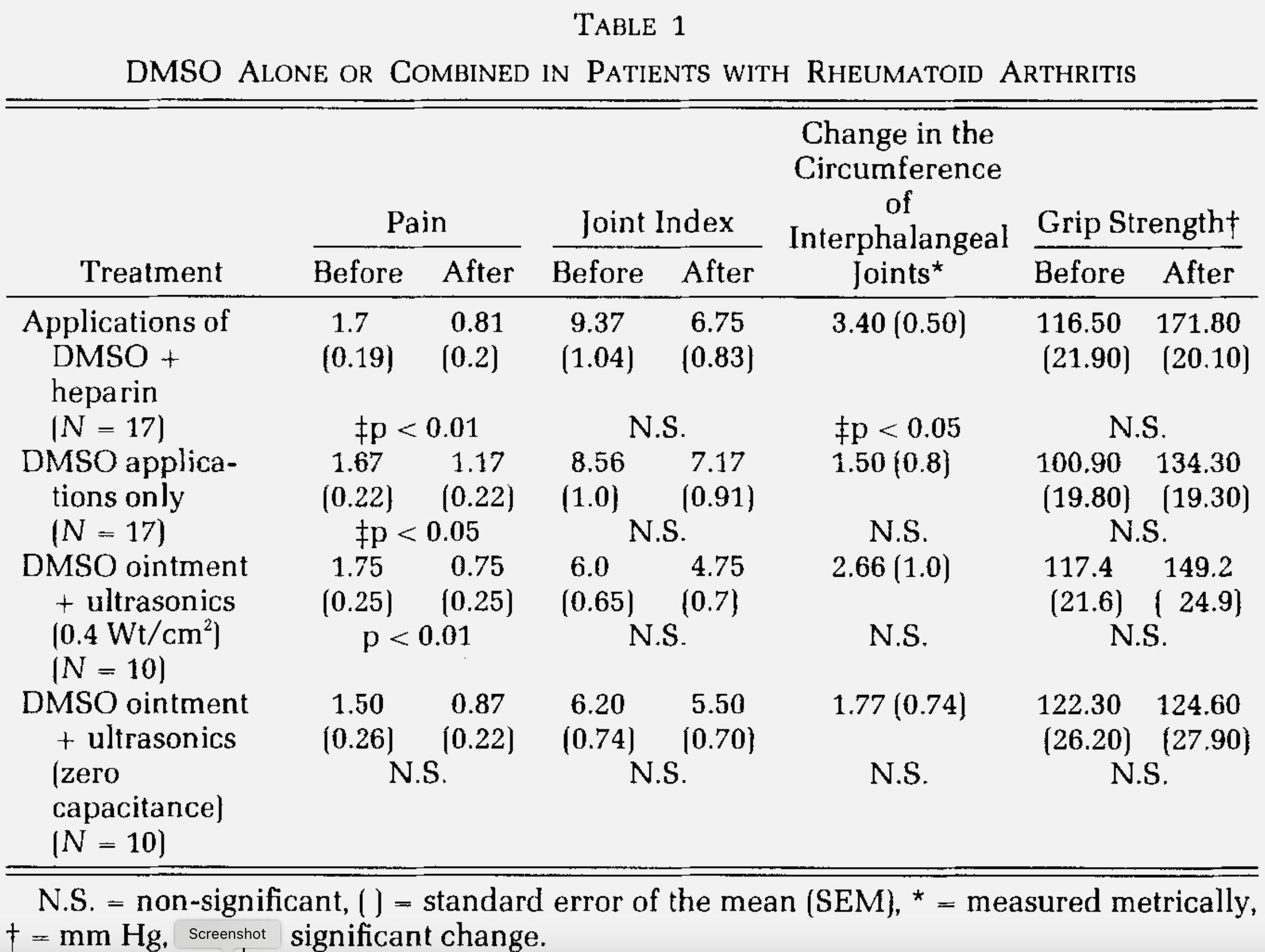 •Two different 1966 studies (this study and this 25 person RCT) found that DMSO plus an anti-parasitic (e.g., 2% topical thiabendazole in 90% DMSO) was an effective treatment for hookworm infections in the skin. This was followed by a 1972 case report in a woman who was given DMSO on one affected knee and DMSO plus thiabendazole on the other in a blinded fashion. The knee that received the combination rapidly recovered from hookworm, while the DMSO only knee got worse and then recovered once it also received the combination.