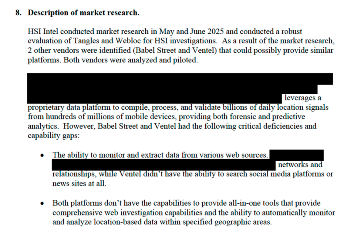 The ICE document is redacted but says a product made by a contractor called Penlink “leverages a proprietary data platform to compile, process, and validate billions of daily location signals from hundreds of millions of mobile devices, providing both forensic and predictive analytics.” The products the document is discussing are Tangles and Webloc.