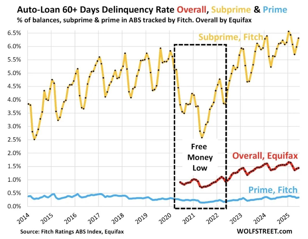 Delinquencies on auto loans 90 days past due reached 5% in the second quarter of 2025, up more than 12% from a year earlier.¹⁶ Net losses in subprime auto ABS were running at 9.44% as of January.¹⁴ Recovery rates were weak because wholesale used-car prices remained high, with the Manheim index still up 2.2% year over year in September.¹⁵