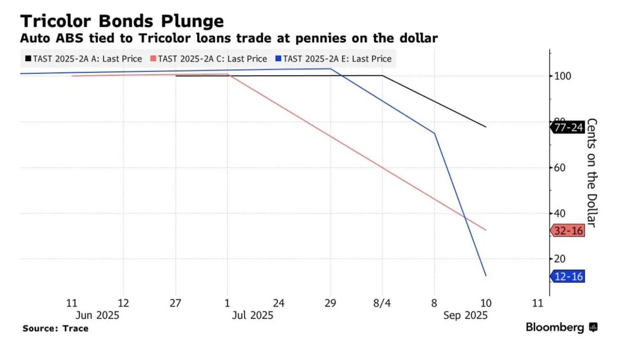 Also in September 2025, Tricolor Holdings, a major subprime auto lender focused on low-credit and undocumented borrowers, filed for bankruptcy and said it would liquidate. Federal prosecutors were investigating allegations that the company had pledged the same collateral multiple times to warehouse lenders.¹⁸ ¹⁹ Big banks including Fifth Third, JPMorgan, and Barclays were left staring at hundreds of millions in potential losses.
