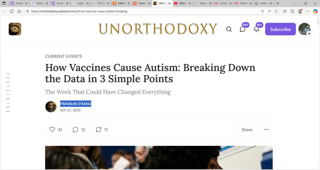 'How Vaccines Cause Autism: Breaking Down the Data in 3 Simple Points The Week That Could Have Changed Everything'; Franklin O'Kanu's excellent stack that could inform RFK Jr. and Makary to refocus on deadliness of vaccines and impact on infants, children, adults & stop this bullshit about Tylenol and circumcised etc., thank you Franklin for seminal top work (support Franklin) and please RFK.Jr please Sir, refocus on vaccines and ask Cassidy to let go of your testicles and please tell The Outlaw Josie Susie Wales that your stones are off limits to her from now on…