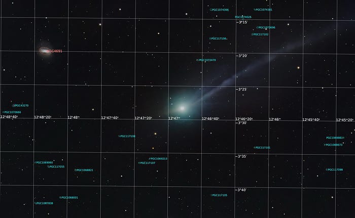 Same image on a coordinate grid with identified objects, such as the galaxy NGC4691 in the upper left. (Credit: Satoru Murata)