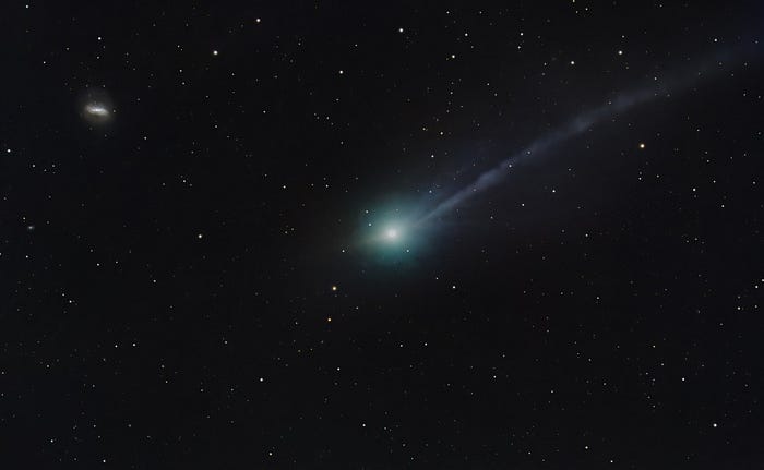 An image of 3I/ATLAS, combining 22 exposures of 30 second each at 17:04 UTC on November 17, 2025 with a 0.4-meter aperture telescope. The sunward direction is pointing to the lower left corner. (Credit: Francois Kugel).