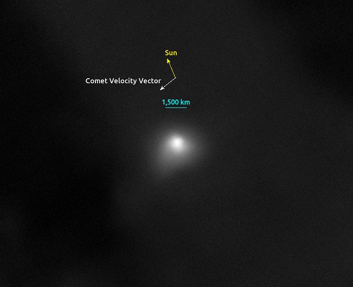 The image taken by the HiRISE camera onboard the Mars Reconnaissance Orbiter on October 3 and available here, shows a fuzzy ball of light. The image features a spatial resolution of 30 kilometers per pixel at 3I/ATLAS’ distance of about 30 million kilometers. Due to spacecraft jitter during the observation period, the light from 3I/ATLAS is smeared by several pixels. In the coming days I will analyze this data quantitatively to extract the most important information out of it.