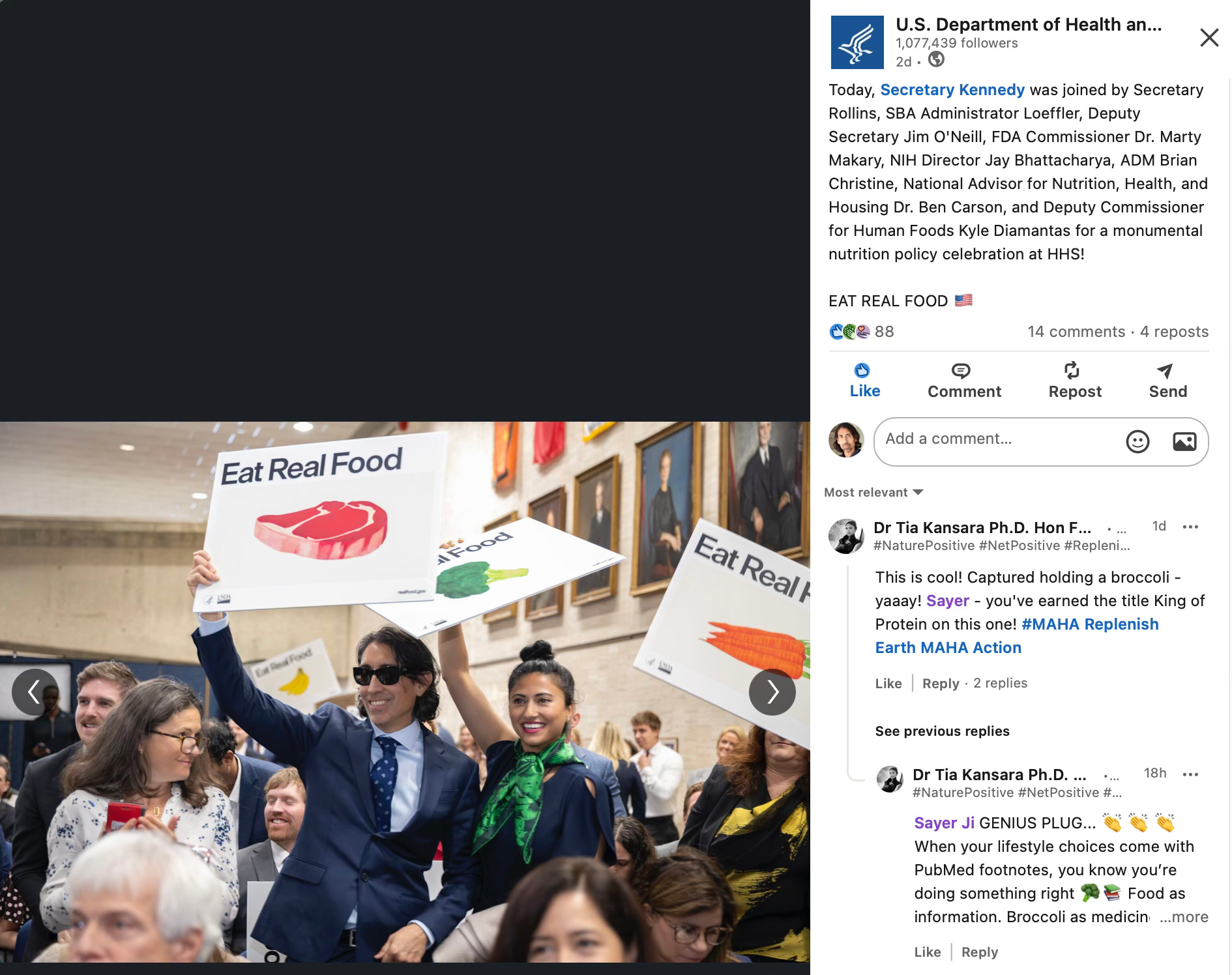 With HHS Secretary Robert F. Kennedy Jr., honoring the launch of the Eat Real Food dietary guidelines—an unprecedented turning point in public health history. For far too long, food has been weaponized by special interests against the health of the public. Today, that trajectory is finally being reversed.