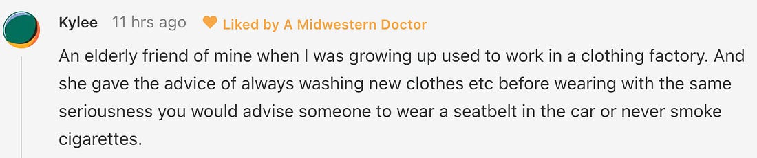 I’ve never forgotten that story, and over time my patients have helped me to appreciate just how many nasty chemicals end up on our clothing that most of us never notice.