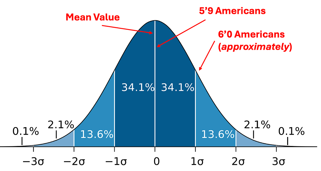 One of the fundamental principles in statistics is that variable phenomena tend to follow a bell curve distribution, with the average value (e.g., adult American men being 5’9—which is a bit above the global average) being by far the most common, while values become exponentially rarer as they move further away from that mean (e.g., only 15% of adult American men are at least six feet tall).