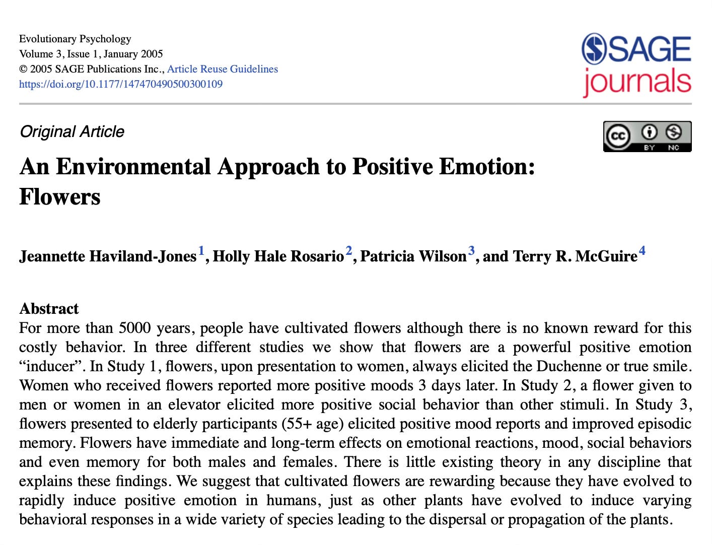 The Rutgers study referenced in this essay is: Haviland-Jones, J., Rosario, H.H., Wilson, P., & McGuire, T.R. (2005). “An Environmental Approach to Positive Emotion: Flowers.” Evolutionary Psychology, 3, 104–132.